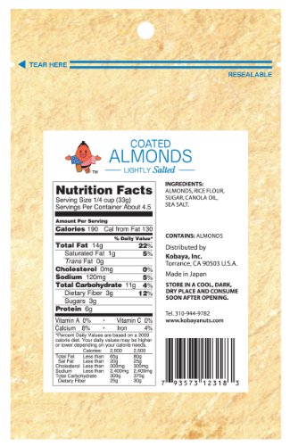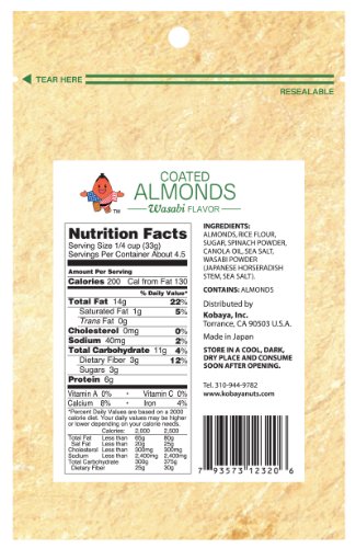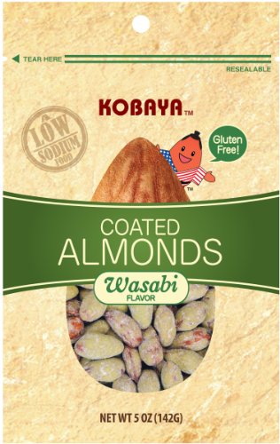 -. Feature : *****FREE SHIPPING*****FREE SHIPPING******FREE SHIPPING*****FREE SHIPPING******FREE SHIPPING***** / Kobaya Coated Almonds are whole, freshly roasted almonds wrapped up in crunchy rice coatings screaming with zesty flavors of Wasabi, Black Pepper, and Lightly Salted. / You can feel good about eating them because KOBAYA coated almonds are good for you with all natural ingredients. They are low in sodium and gluten free. / The best of California almonds are carefully selected and processed by Kobayashi Shoji Co, Ltd., parent company of Kobaya, Inc., a company with 30 years of experience in processing nuts, fruits, and vegetables. Kobaya believes in using natural ingredients and does not add any artificial colors, flavors, or preservatives. / These meticulously selected almonds are coated with non-GMO rice flour mixed with all natural flavors, then carefully roasted to a crunchy perfection. The simple and short ingredients list for each item show how these are not just tasty but really good for you. The 5oz. packages come in convenient resealable and attractive stand up pouches and have a shelf life of 12 months.