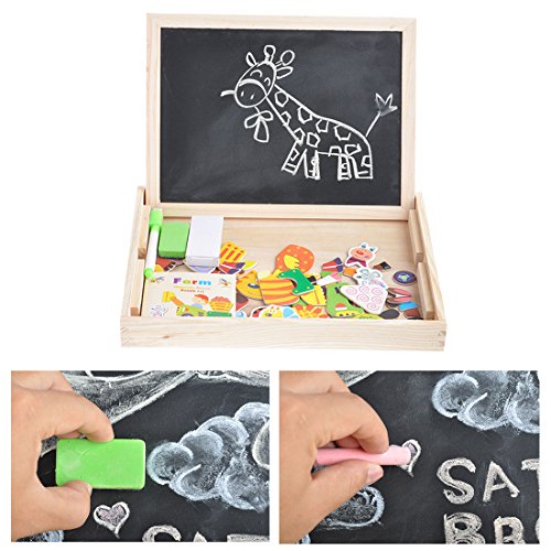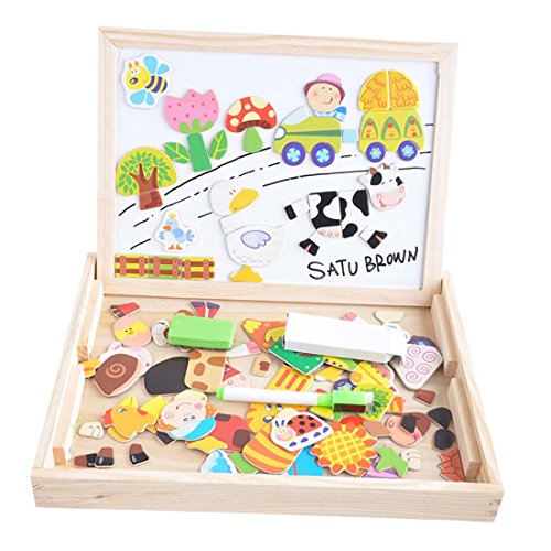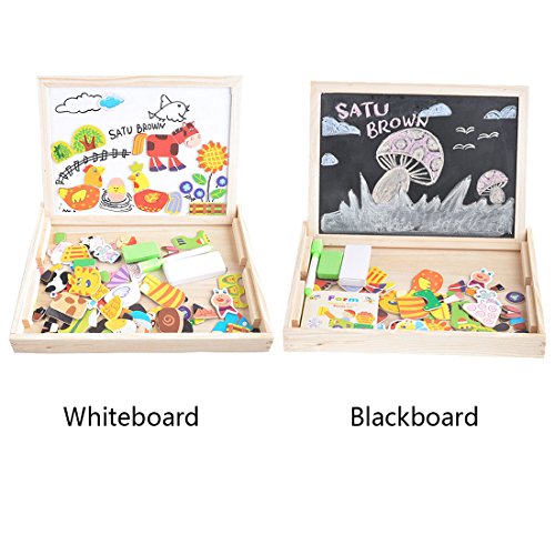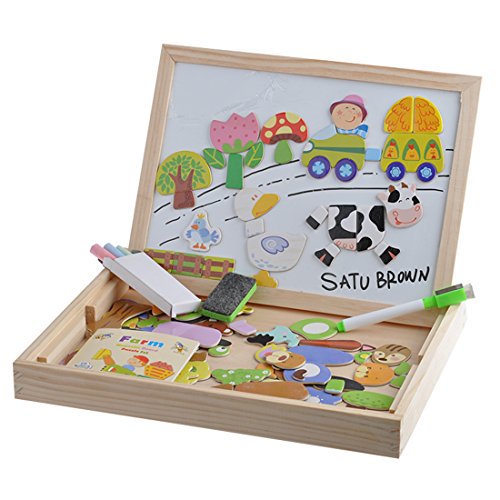 -. Binding : Toy -. Brand : Satu Brown -. Color : multi color -. EAN : 0754970806468 -. Feature : Please remove the thin FILM COVER on the whiteboard before using it. Package Size: 30*23*3.8cm. The toy set includes: Wooden board, Storage box, Magnetic puzzles, Chalks, Board pen, Eraser, Manual / Multi-Functional Toy: Children can play cartoon Puzzles with card pieces and draw with the pen on the white magnetic side; on the black chalkboard, it can be used to draw and write with the colorful chalks / With more than 100 pieces puzzle cards (including people, animal, plant), keeping kids quiet and busy; portable and easy-carrying, great toy for children in a car or plane travel, park, outdoor etc. / Super-high quality wooden material, polished elaborately without burrs, environmental, non-toxic and absolutely safe toy for your kids / Warning: CHOKING HAZARD. This product contains small magnetic cards. Do not put them in mouth or nose. NOT suitable for kids under 3 years. Toys should be used under the adult supervision -. Genre : Creative -. IsAdultProduct : 0 -. ItemPartNumber : toy-003-fa -. Label : Satu Brown -. Manufacturer : Satu Brown -. MPN : toy-003-fa -. PackageQuantity : 1 -. PartNumber : toy-003-fa -. ProductGroup : Toy -. ProductTypeName : TOYS_AND_GAMES -. Publisher : Satu Brown -. Studio : Satu Brown -. Title : Wooden Toy Magnetic Dry Erase Board Puzzles 100 Pieces Games, Satu Brown Double Face Jigsaw& Drawing Easel Chalkboard Popular Educational Learning Toys (Farm) -. UPC : 754970806468