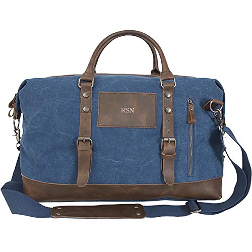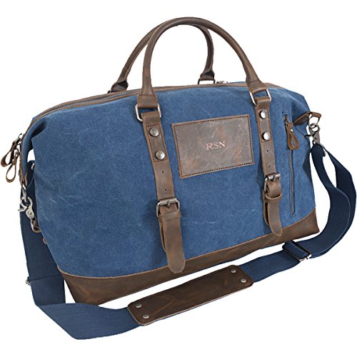 Studio : JDS Publisher : JDS Binding : Misc. Product Description Our personalized canvas duffel bag has timeless style and is perfect for the 2-3 day trip! The compact size makes it an ideal carry-on bag that will fit under your seat. Remove the strap and grab and go with the two 14" easy carry handles or use the adjustable shoulder strap with its body hugging design. Personalize this bag with 3 initials in the order of F,M,L. Item Specifications: Large main compartment has double zippers 100% polyester lining Strap adjusts from 36 to 60 inches for the perfect fit. Personalize with 3 initials in the order of F, M, L Numerous zippered pockets will hold your techie and small personal items. The 4 bottom brass feet protect the underside from getting dirty. Product Size: 18" (w) x 11 1/2" (h) x 9" (d). Material: 16 oz. washed blue cotton canvas and split leather. 0