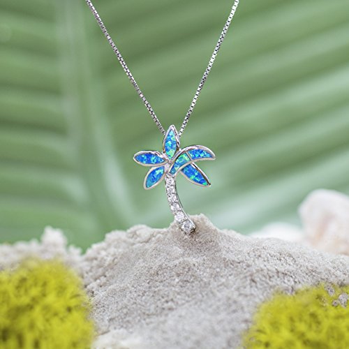This simple sterling silver palm tree necklace with simulated blue opal inlay is both elegant and playful. Perfect for any collection. Comes with a 16"-18" adjustable box chain. Gift box included. From Honolulu Jewelry Company, Honolulu, Hawaii.Feature
