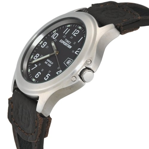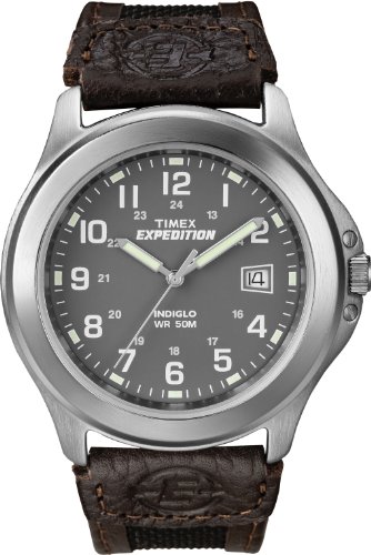 Amazon.com Product Description Designed for active, outdoor lifestyles--as well as the rigors of harsh urban landscapes--the full-sized Timex T40091 Expedition stainless steel watch adds a stylish yet rugged complement to your everyday wear. It features a large, round silver stainless steel watch case with flattened, brushed bezel that frames a gray dial background with Arabic numerals, inset 24-hour notations, large, luminous stick hands (with seconds hand), and a date display at 3 o'clock. With the Quick Date function, you can set the date on the watch without turning the crown for every 24-hour period. Just pull the stem halfway out, and turn until desired date is reached. It also offers an 8-year battery life, water resistance to 50 meters (165 feet), and a durable strap that mixes leather and nylon. The Indiglo night-light uniformly lights the surface of the watch dial using patented blue electroluminescent lighting technology. It uses less battery power than most other watch illumination systems, enabling your watch battery to last longer. 0