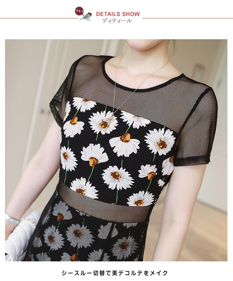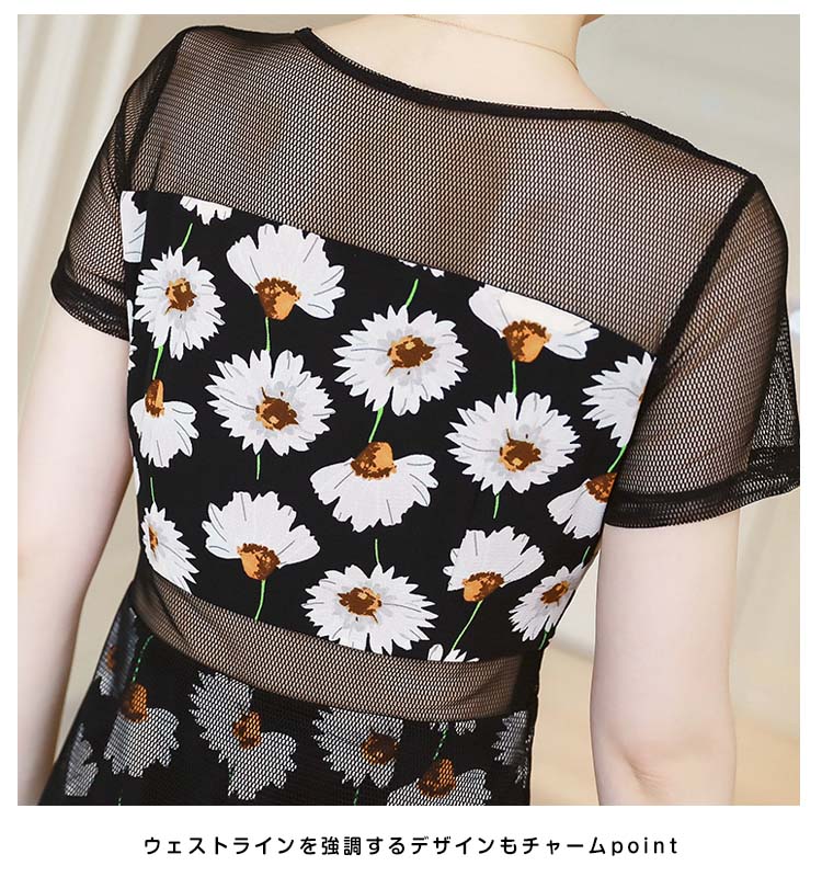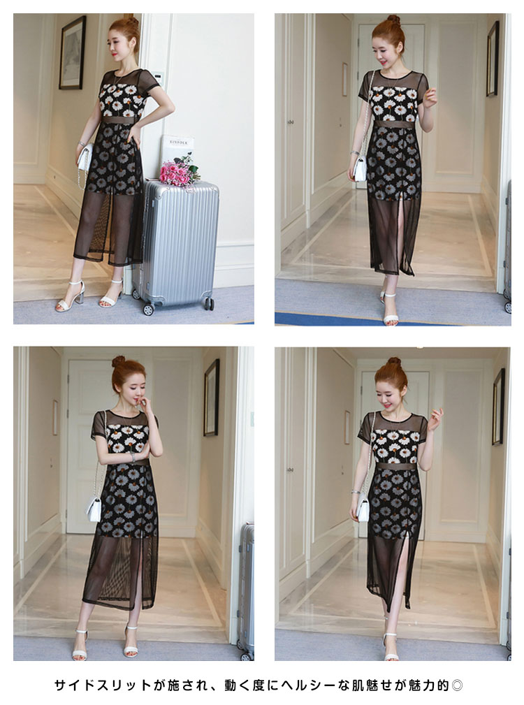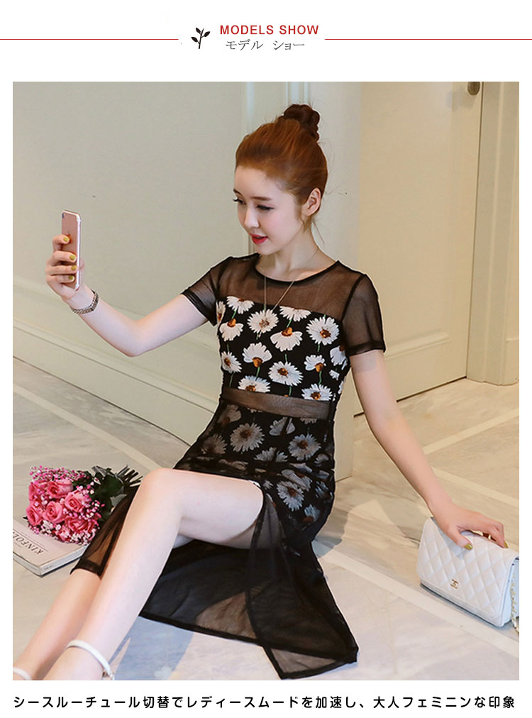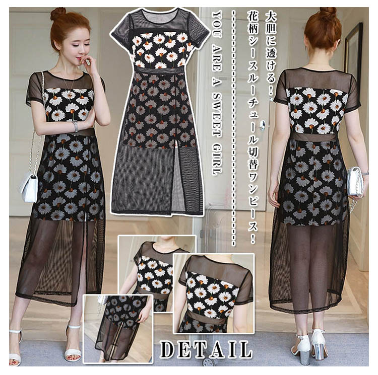 | 大胆に透ける!花柄シースルーチュール切替ワンピース!シースルーチュール切替でレディースムードを加速し、大人フェミニンな印象サイドスリットが施され、動く度にヘルシーな肌魅せが魅力的◎裏地は膝上までですから、透け感を楽しめるデザインもワンポイント、軽やかな印象に。普段着は勿論、パーティーなど場合もお勧めです。 | |