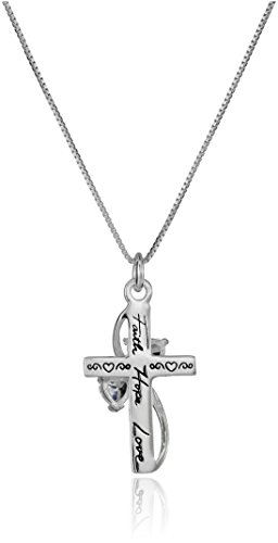 Thoughtfully engraved, this sterling silver necklace features a cross pendant encased by two heart-shaped cubic zirconia stones.Feature