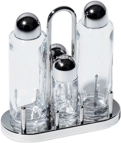 Studio : Alessi Publisher : Alessi Binding : Kitchen Product Description 5070 Features: -18/10 stainless steel bottle domes and stand. -Four crystal glass bottles. Item: -Shakers/Salt And Pepper Sets. Material: -Stainless Steel/Glass. Color: -Natural. Style: -Contemporary. Dimensions: Overall Height - Top to Bottom: -7.5". Overall Width - Side to Side: -7". Overall Depth - Front to Back: -3.25". 0