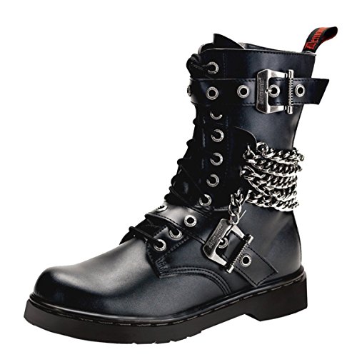 Product Description These mens black combat boots have everything. They feature buckle straps, chains and a front lace up.0