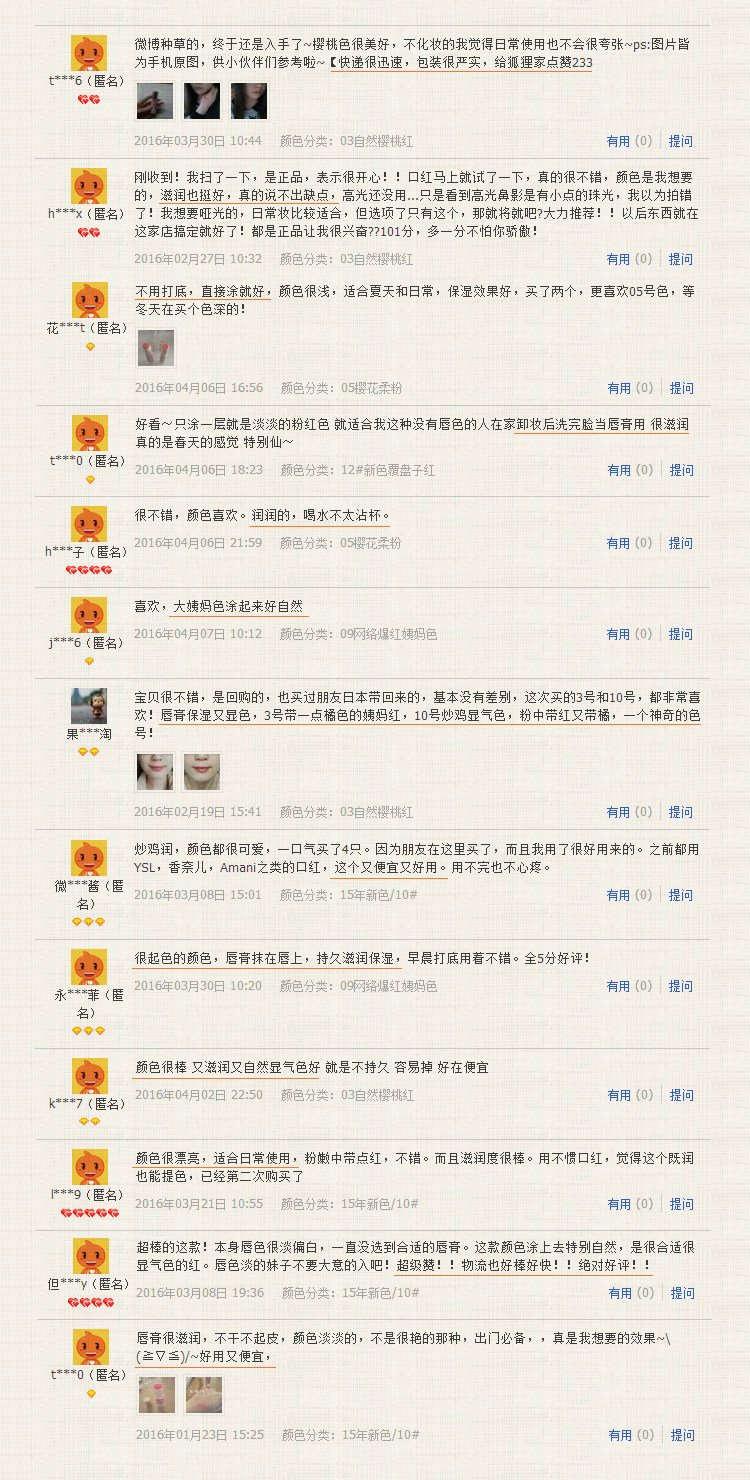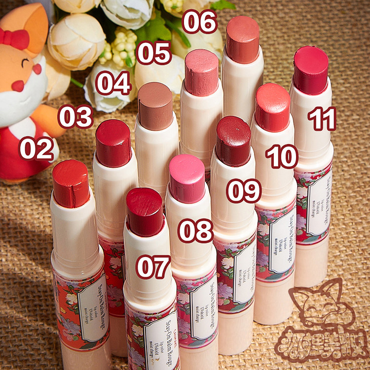 我几乎每个颜色都收了一只呀,啊啊啊啊啊啊,因为实在太好用了,之前一直喜欢收集各种颜色的口红,但是每次都需要再搭配一只保湿润唇膏,因为口红总是很干,涂上就会显唇纹且起皮,自从有了这款口红,我算是找到真爱了,就这么一只,保湿+颜色全部解决。送了老妈一只,她也是爱不释手的,毕竟带颜色的口红干是通病呀,canmake的这个唇膏真的是炒鸡美好,真的很润很保湿,而且一天下来都是润润的,显得嘴巴很健康!竟然这货还有防晒系数,spf15虽然不高,但是在唇膏界也是足够用了,紫外线会让我们的唇部色素沉淀,唇部变深,所以有多少妹子其实都没有注重过唇部的防晒,canmake很贴心有木有?! 颜色选择:(没有的色号都是停产咯) 02# 甜蜜橙: 亮麗時尚橙調 03# 自然樱桃红:可以讓膚色變得美麗 05# 樱花柔粉NEW :柔美可人,软妹子无辜妆推荐 06# 奶油杏色NEW:轻松百搭,不挑妆容,比较有气色的裸妆感 08# 马卡龙玫红 09# 性感的姨妈色 10# 15年新色隆重登场,期待妹子们提供真人秀! 11# 15秋冬新色,梅子色是今年很流行的复古色哦~擦上去气场满满! 12# 16年新色,覆盘子红涂上去充满了春天的气息,神采飞扬!
