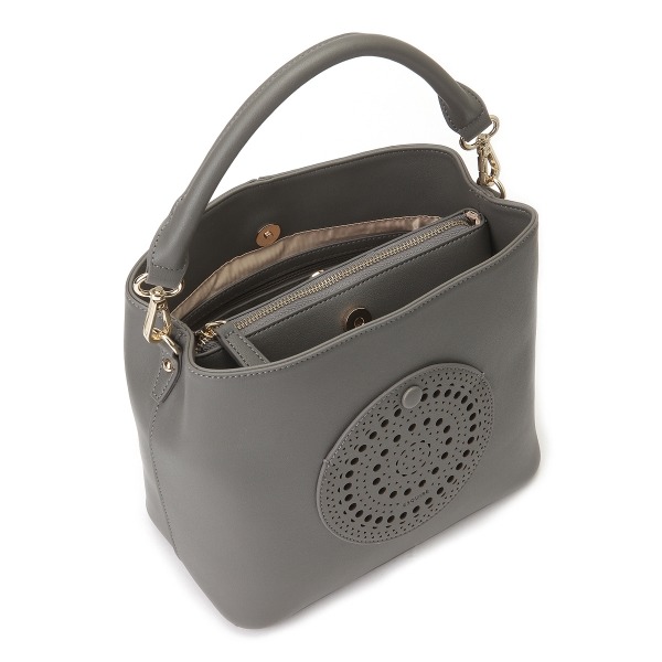 트랜디한 버킷백 쉐입에 레이스 모양의 펀칭 디테일로 포인트를 주었으며 SS시즌에 세련된 스타일링이 가능하고 원형 레이스 펀칭 포인트는 포켓으로 사용이 가능한 디자인입니다