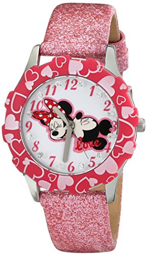 -. Binding : Watch -. Brand : Disney -. Color : Pink -. Department : girls -. EAN : 0843231077799 -. Feature : Minnie Mouse watch featuring pink glitter strap, heart-P.R.Int bezel, and faux-gem-studded dial / 32 mm stainless steel case with mineral dial window / Quartz movement with analog display / Faux-leather band with buckle closure / Water resistant to 30 m (99 ft) -. Label : Disney -. Manufacturer : Disney -. Model : W001596 -. MPN : W001596 -. PackageQuantity : 1 -. PartNumber : W001596 -. ProductGroup : Watch -. ProductTypeName : WATCH -. Publisher : Disney -. Studio : Disney -. Title : Disney Kids' W001596 Minnie Mouse Stainless Steel Watch with Pink Band -. UPC : 843231077799