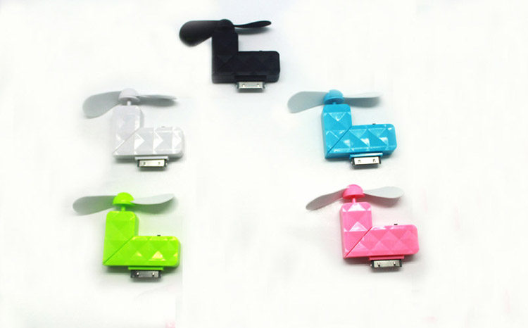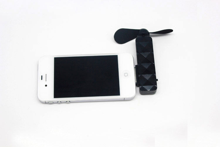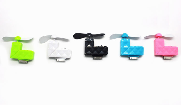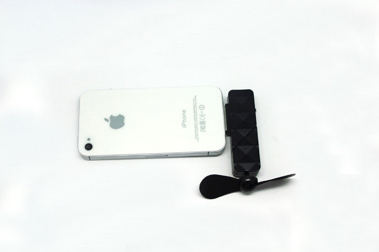 小电风扇一头是扇叶,而另外一口是iPhone接头,把电扇可以直接插在iPhone 4底部的充电口上, 这样就可以让iPhone 4变身成为一部手持小电扇了。 这个周边配件并没有电池,完全通过iPhone 4来供电,可连续工作6时。