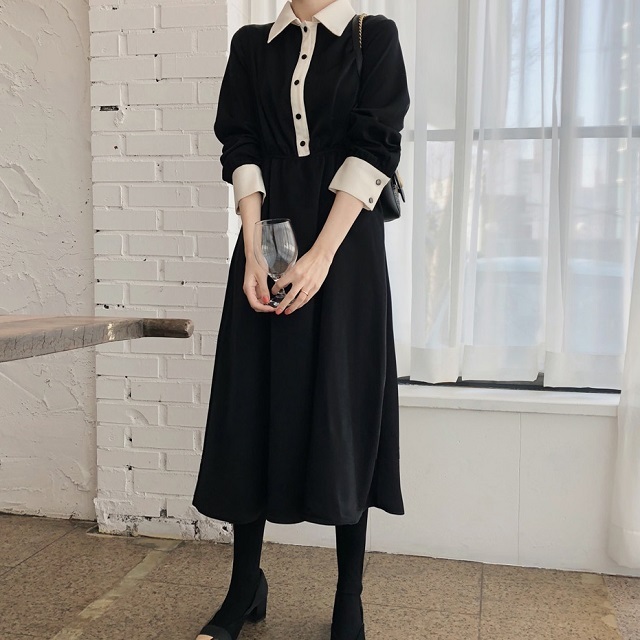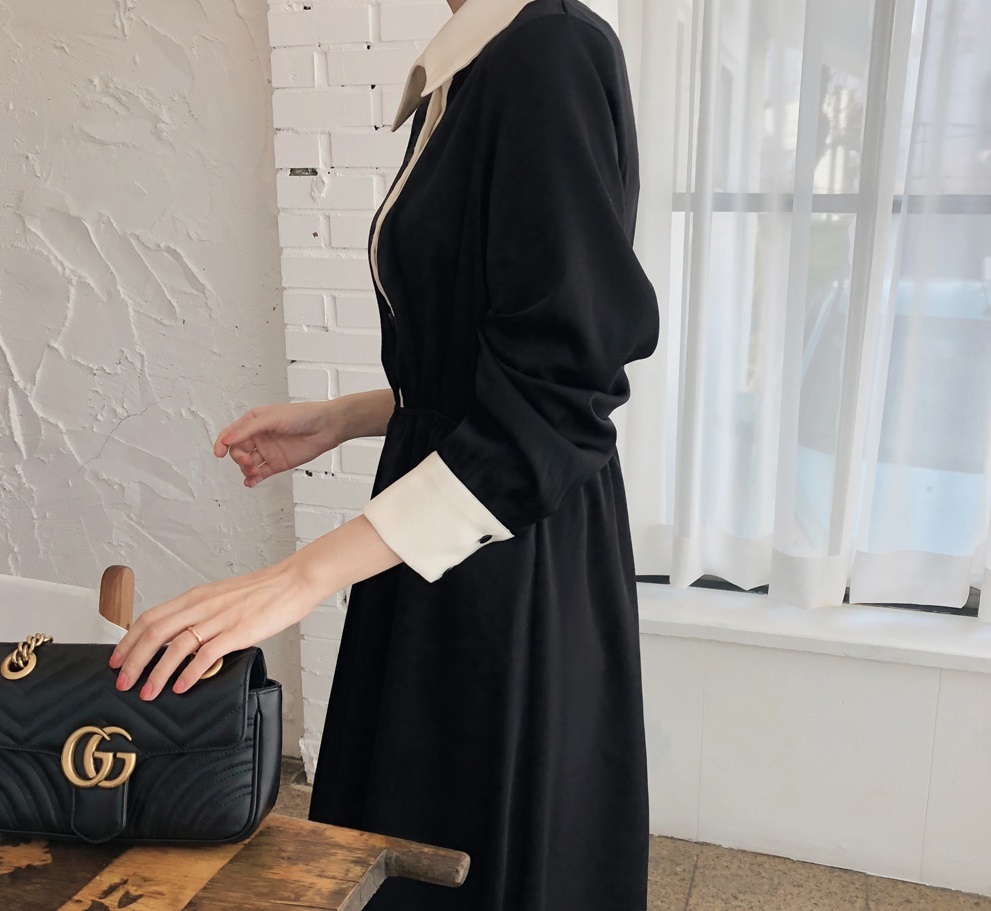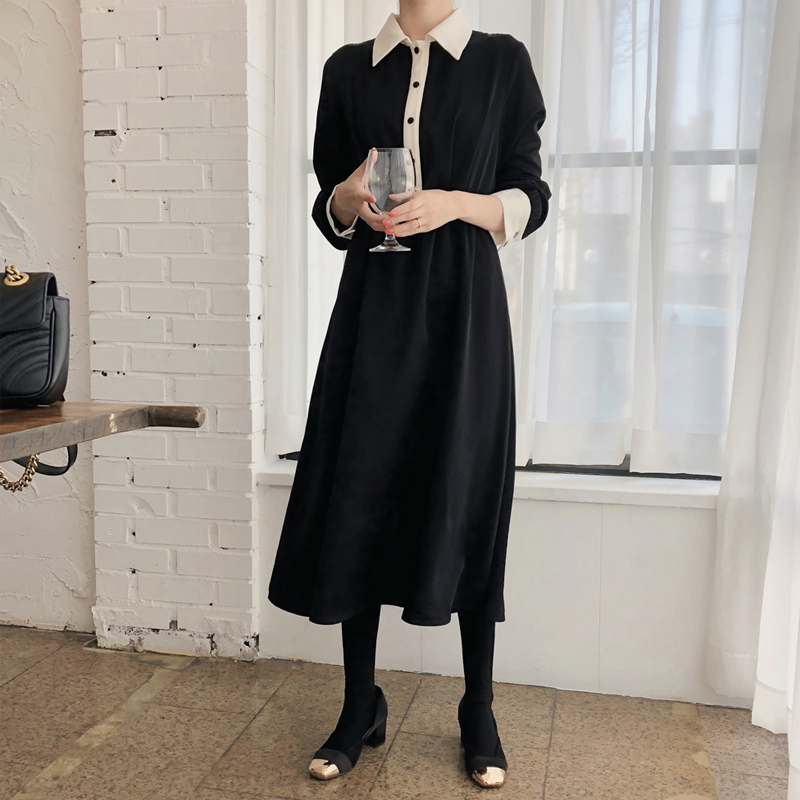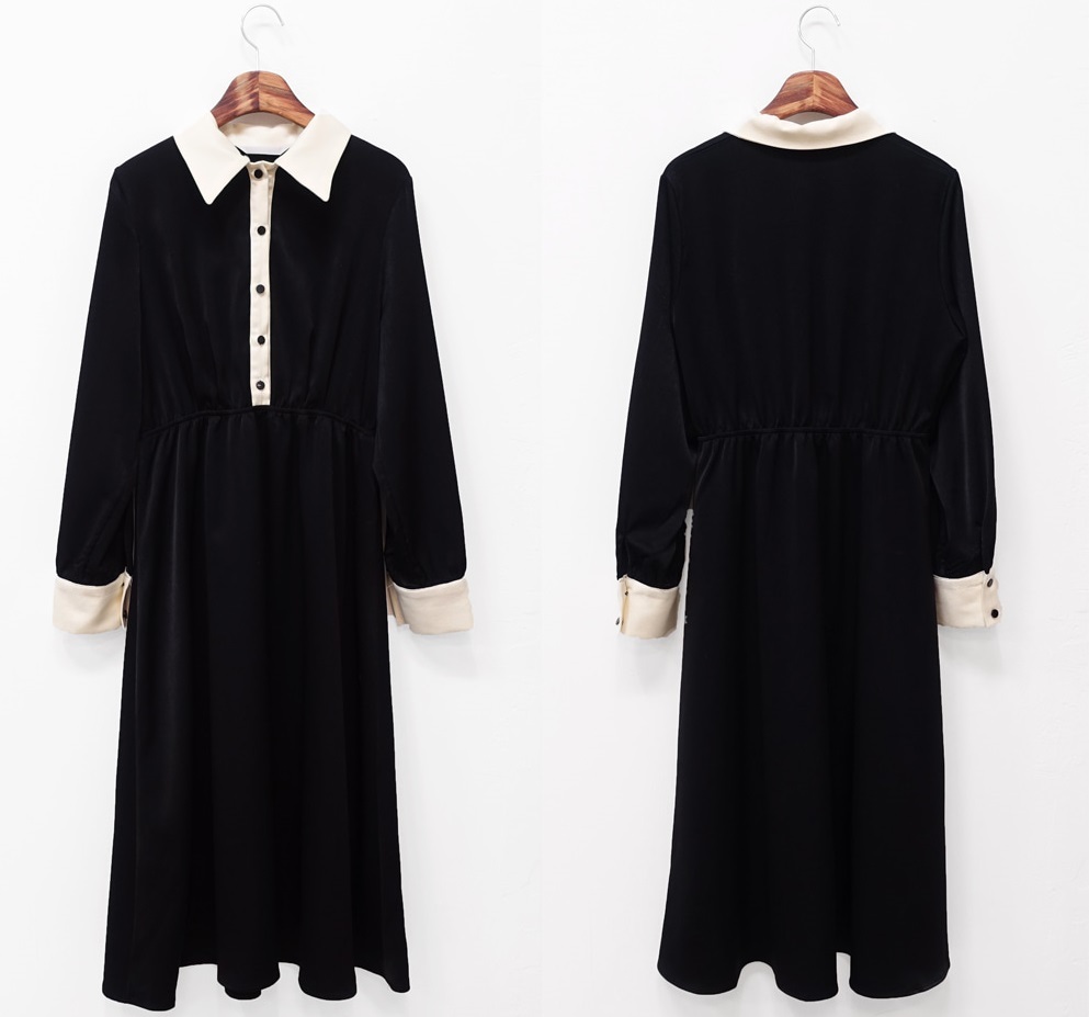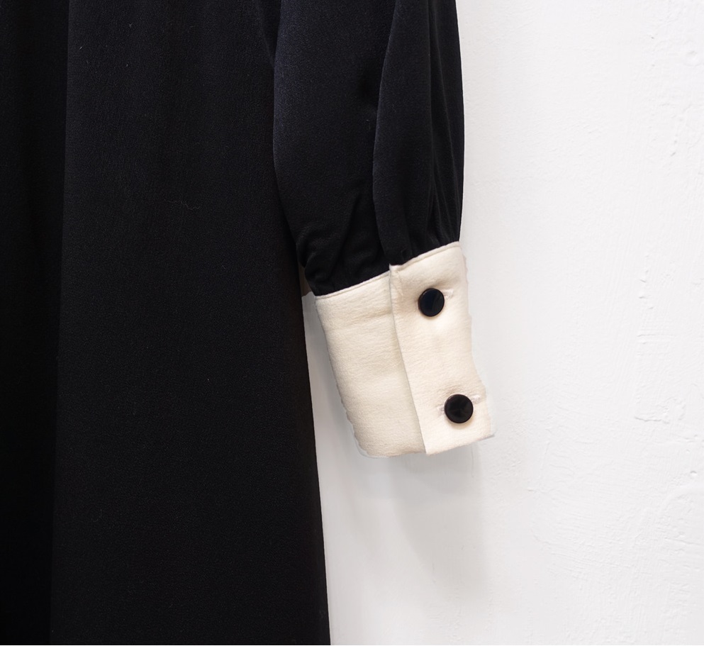 襟とボタンライン、袖口のバイカラーがモードな雰囲気を醸しだすワンピースです☆