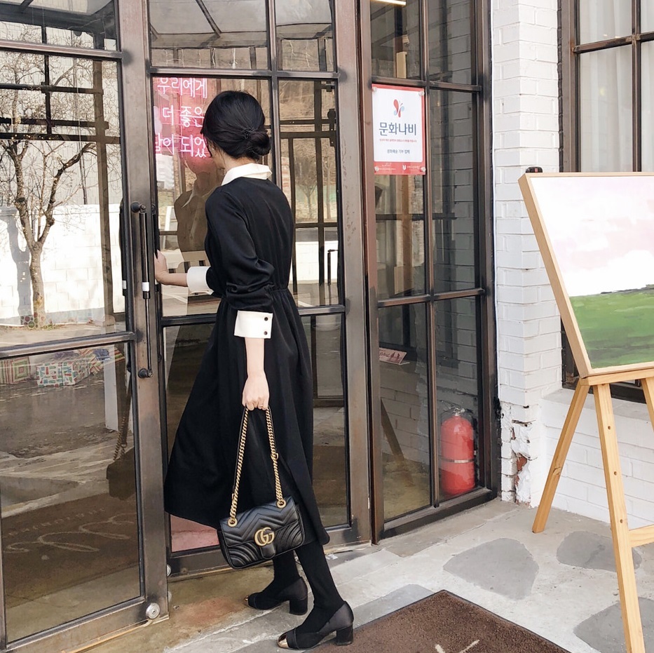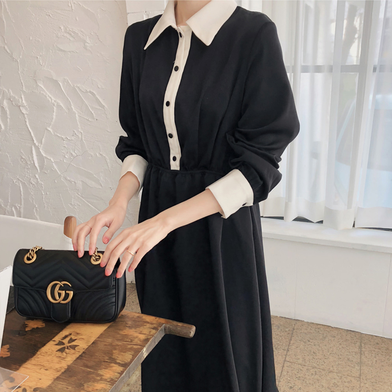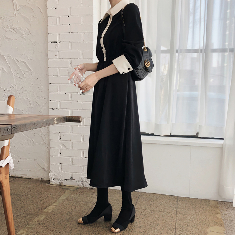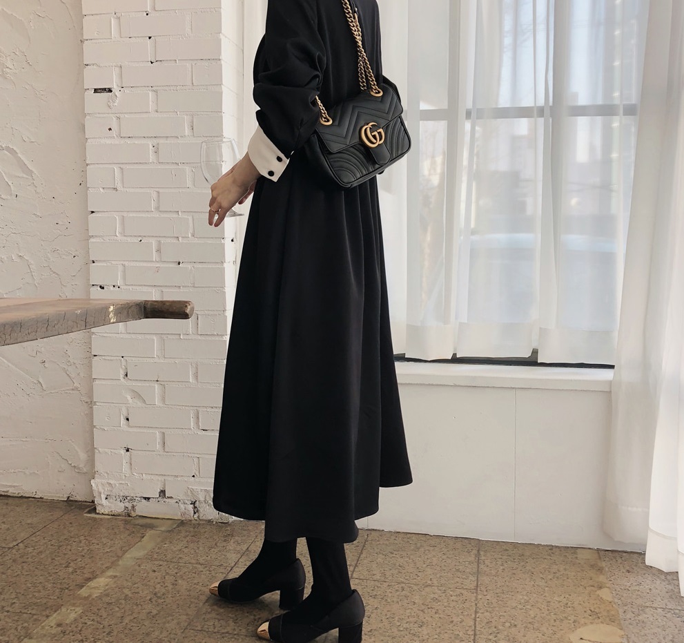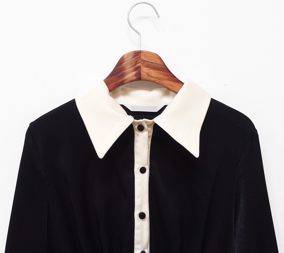 襟とボタンライン、袖口のバイカラーがモードな雰囲気を醸しだすワンピースです☆
