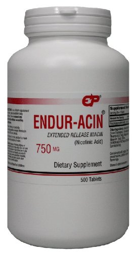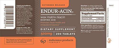 Endur-Acin Extended Release Wax Matrix Niacin is a unique dietary supplement designed for men and women interested in advanced support for heart health and cholesterol balance.* Endur-Acin provides nicotinic acid - the only form of niacin with targeted benefits for heart health and lipid metabolism - in a proprietary vegetable-based wax matrix. This unique combination not only ensures a gradual, measured release of nicotinic acid over a 6-8 hour period, but also helps eliminate digestive upset and skin flushing that can occur with immediate-release forms.* Endur-Acin is backed by clinical research confirming its ability to help maintain healthy cholesterol levels within the normal range.* ("Flush-free" forms of niacin may reduce fllushing, but these forms have not been clinically shown to benefit heart health.) Endur-Acin is available in three strengths - 250 mg, 500 mg and 750 mg - for easy compliance with doctor recommendations. In addition, it's free of salt, sugar, starch, preservatives, artificial colors or flavorings, and common allergens (milk, egg, fish, shellfish, tree nuts, peanuts, wheat and soy). As with all dietary supplements, consult your physician prior to use if you have or suspect a medical condition, are taking any medications, or are nursing or pregnant. See label for more details. *These statements have not been evaluated by the Food and Drug Administration. This product is not intended to diagnose, treat, cure or prevent any disease.Feature