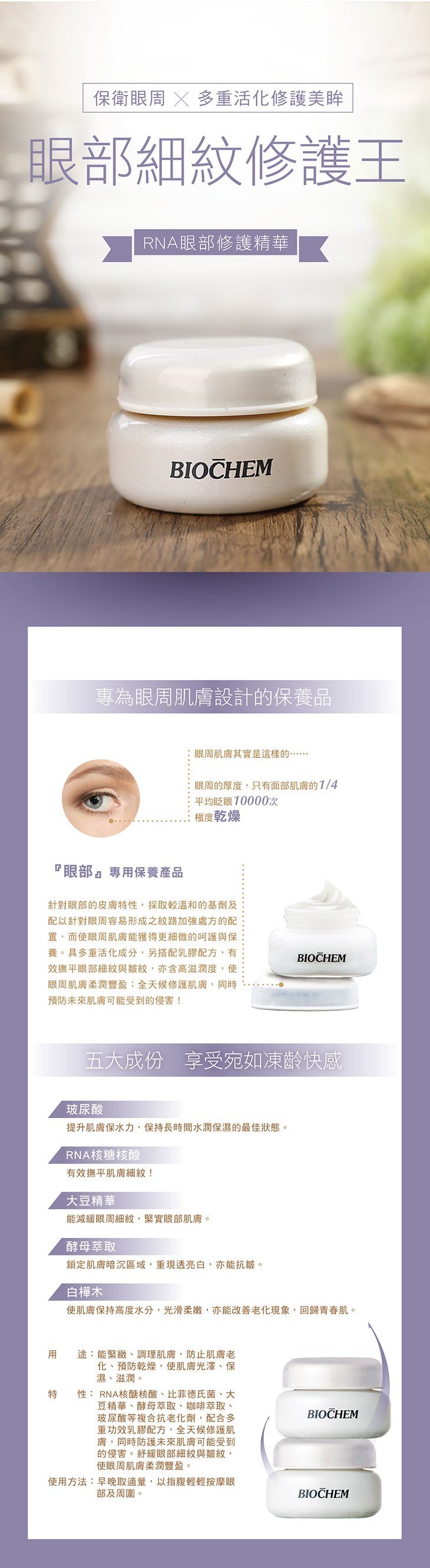 Multi solutions help to increase the elasticity and moisture for the around eye skin and smooth the fine lines.