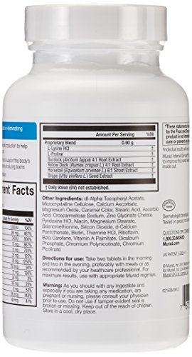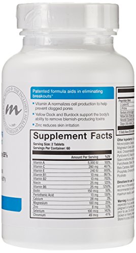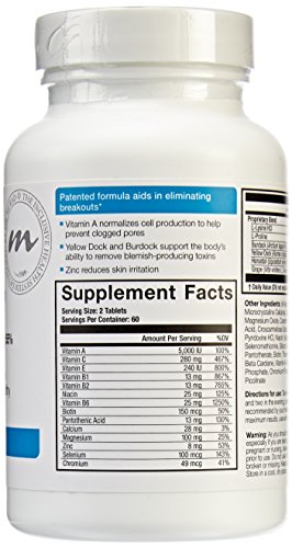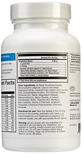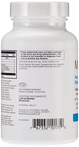 Provides Patented Internal Defense Against Breakouts By: Reducing blemishes by 55% in six weeks. Encouraging consistently clear, healthy skin. Patented Formula Aids in Eliminating Breakouts: Vitamin A normalizes cell production to help prevent clogged pores. Yellow dock and Burdock support the baby's ability to remove blemish-producing toxins. Zinc reduces skin irritation. (These statements have not been evaluated by the Food and Drug Administration. This product is not intended to diagnose, treat, cure or protect any disease). Dermatologist developed and tested. Murad does not test on animals. Contains No Yeast, Dairy, Egg, Gluten, Corn, Soy or Wheat. Contains No Starch, Salt, Preservatives, or Artificial Color, Flavor or Fragrance. Made in the USA.Feature