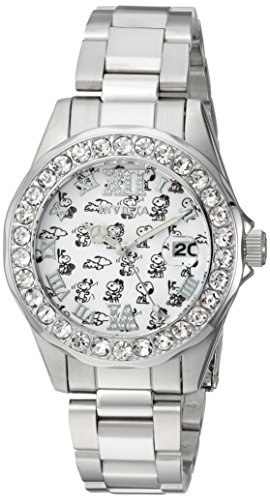 50 white crystals accenting the white and black metal dial with silver luminous hands and silver hour markers, date display, steel stainless steel band and push crown