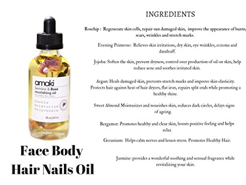 -. Title : Nourishing Oil for Face Body Hair Nails- Blend of Evening P.R.Imrose, Argan, Jojoba, Sweet Almond, Rosehip with Bergamot, Rose Geranium and Jasmine Essential Oil