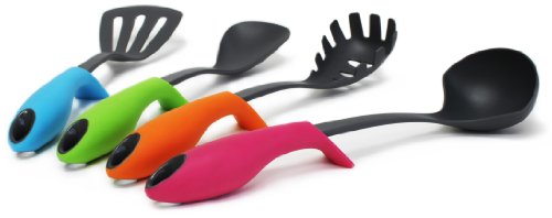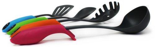 - Feature : 4-Piece set includes a spoon, spaghetti server, ladle, slotted turner and sauce spoon / Elevate handles heads keep utensils off kitchen counter to reduce messes / Soft grips offer comfortable feel / Dishwasher-safe / Ideal for use with nonstick cookware and bakeware