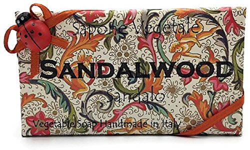 -. Feature : Alchimia Ladybug Sandalwood Vegetable Soap Handmade In Italy - 10.5 Ounce / 100% Vegetable Soap / Hand wrapped with decorative Tassotti paper, ribbon, and ladybug embellishment. / Taking a cue from the properties of plants and flowers and are sometimes integrated with chemical elements of neural origin such as vitamins, protein bases, vegetable oils. The colors tend to ivory some of our soaps, which originate from the natural color of used plant extracts. / Tassotti paper design may vary per soap bar