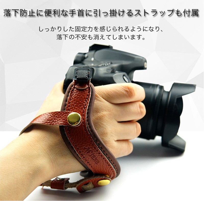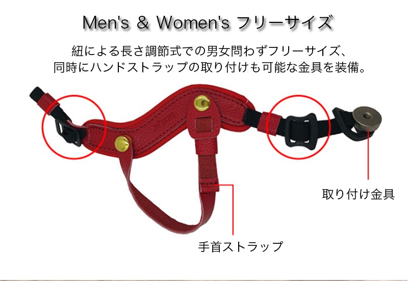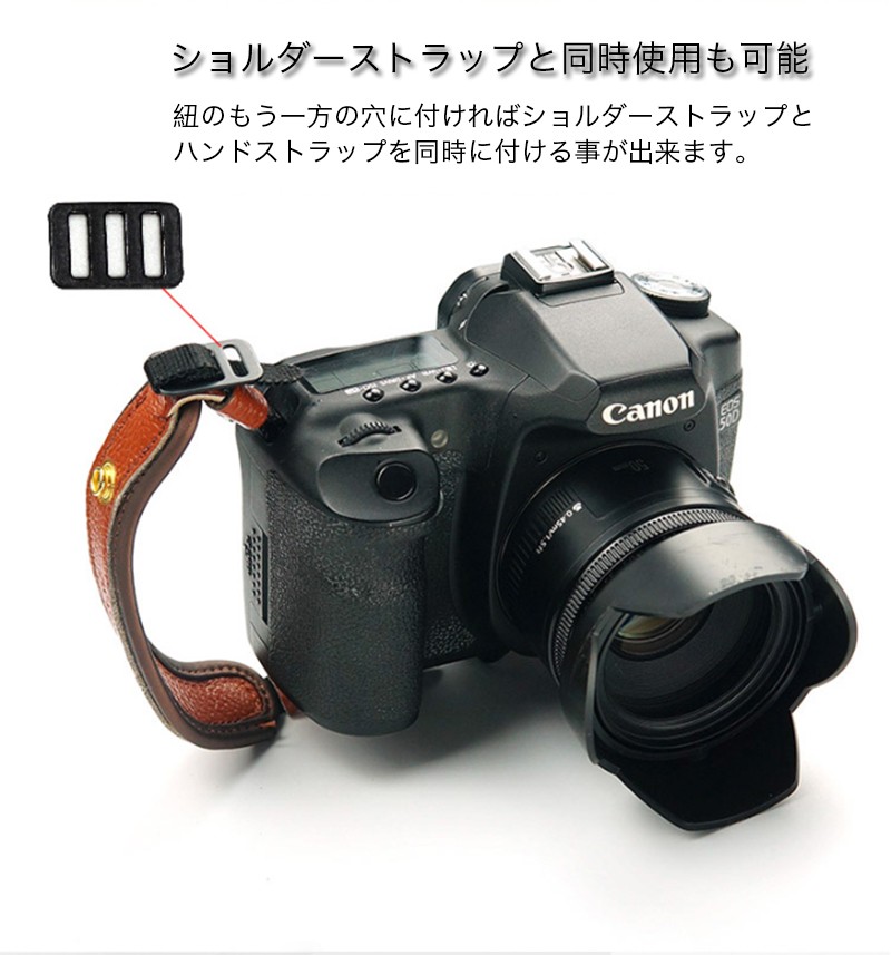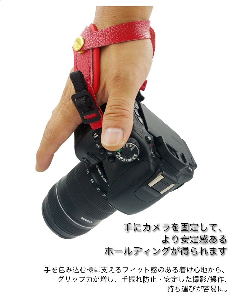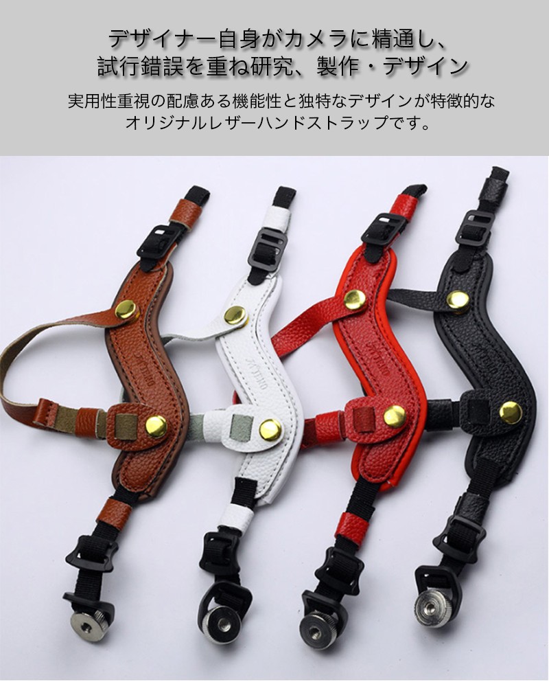 ★「対応機種」一眼レフ ミラーレス コンパクト キャノン ニコン ソニー 汎用★「カラー」ブラウン(茶)、ホワイト(白)、レッド(赤)、ブラック(黒)★「商品特徴」実用性重視の配慮ある機能性と独特なデザインが特徴的なオリジナルレザーハンドストラップです。しっかりした固定力を感じられるようになり、落下の不安も消えてしまいます。紐のもう一方の穴に付ければショルダーストラップとハンドストラップを同時に付ける事が出来ます。★「キーワード」 一眼レフ ミラーレス コンパクト キャノン Cacon ニコン Nikon ソニー Sony 汎用 ハンドストラップ レザー 本革製 手首ストラップ 実用性重視 フリーサイズ 長さ調節式 落下防止 安定感 固定力 しっかり