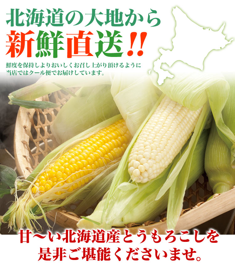 ゴールドラッシュ(皮つき・不揃い)ホワイトコーン(皮つき・不揃い)■原産地:北海道産■内容量:各10本(M~2Lサイズ混合)■賞味目安:到着後は、皮を剥いて茹でてから冷蔵庫で保存し、なるべく早めにお召し上がり下さい。■発送形態:冷蔵発送■商品について:サイズに多少バラつきが有ります。■発送予定:8月下旬前後頃から順次■お届け日指定不可