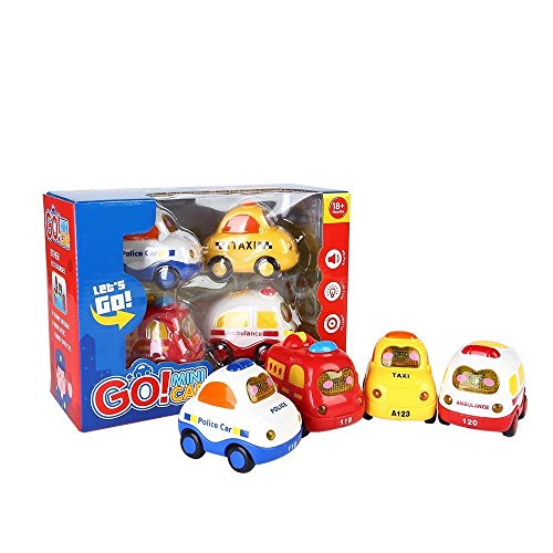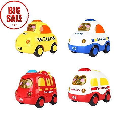 4 pieces mini car set is constructed of non-toxic plastic and has a funny design! Includes a toy taxi, a police car, a fire engine and an ambulance.