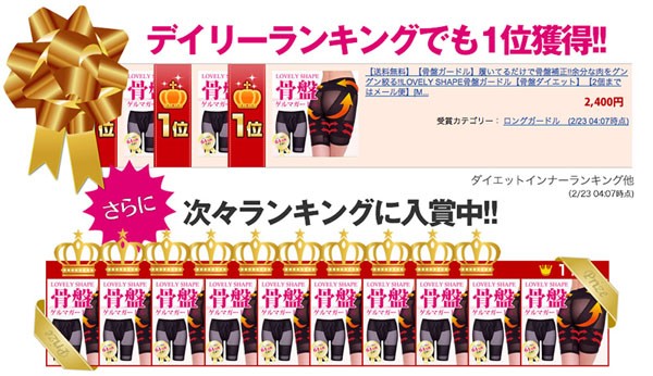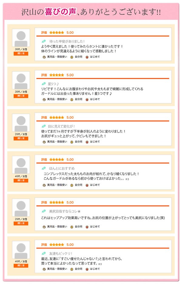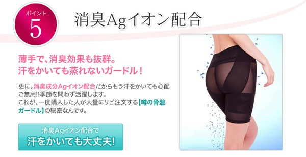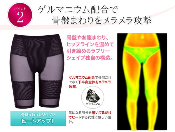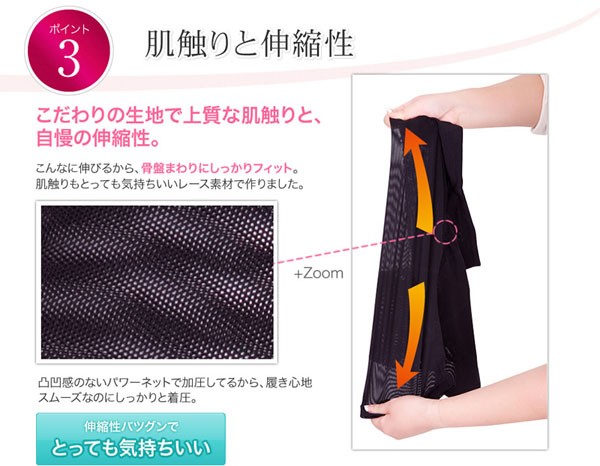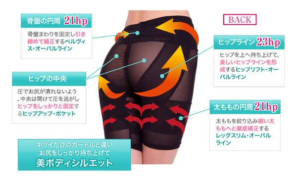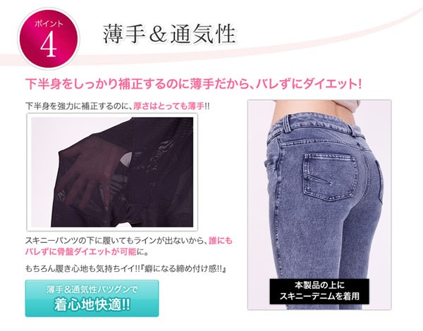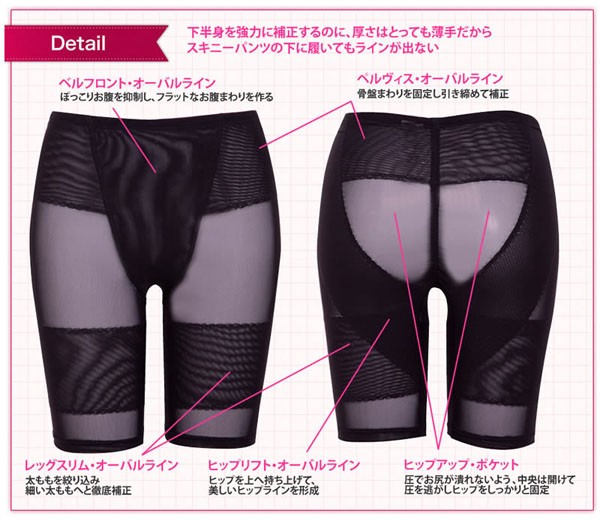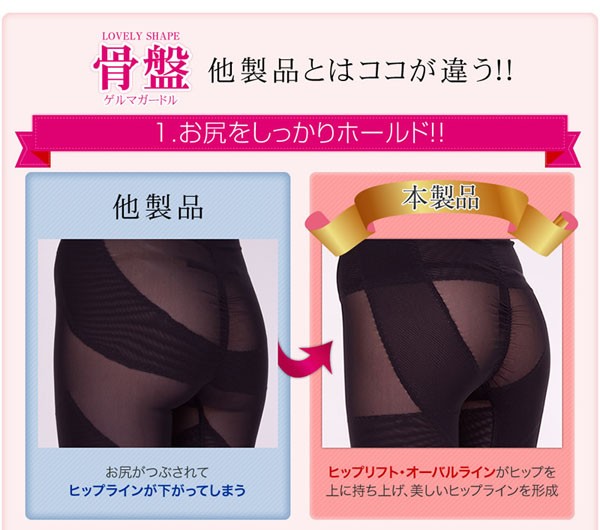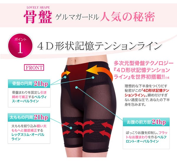 | 配合目的 | ※「下半身」とはガードルが及ぶ下半身の範囲を意味する ※1…シリーズ全商品の総出荷数量(2013/2/16現在) ※2…装着時に骨盤まわりの外観を美しく補正するの意 ※3…着圧することで細く魅せることを意味する ※4…4Dオーバル・ラインは商標であり、本製品が初の搭載である ※5…自社比 ※6…本製品が元の形状に戻りやすい性質を持つ |