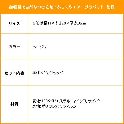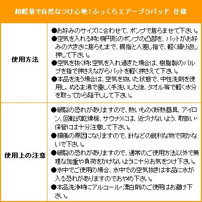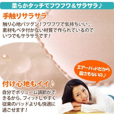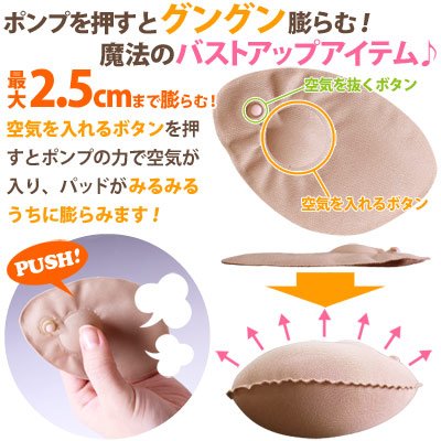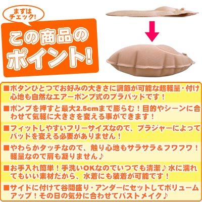 -. Feature : ボタンひとつでお好みの大きさに調節が可能な超軽量・付け心地も自然なエアーポンプ式のブラパッドです! / ポンプを押すと最大2.5cmまで膨らむ!目的やシーンに合わせて気軽に大きさを変える事ができます! / フィットしやすいフリーサイズなので、ブラジャーによってパッドを変える必要がありません! / やわらかタッチなので、触り心地もサラサラ&フワフワ!軽量なので肩も凝りません♪ / お手入れ簡単!手洗いOKなのでいつでも清潔♪水に濡れてもいい素材だから、水着にも装着が可能です!