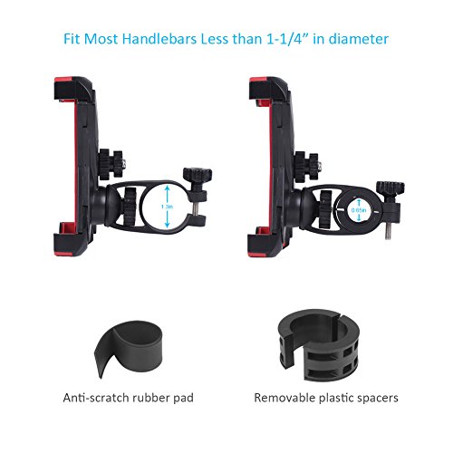 Compatibility Device: Suitable for 3.5-7' smartphone, includes but not limited as follow: Apple: iPhone 7/ 7 Plus/ 6s/ 6s Plus/ 6 / 5s/ 5c/SE Samsung: Galaxy S8/ S8 / S7/ S7 edge, Note 5/ 4/ 3/ 2 Nexus: 6P/ 5X. HTC, Nokia, Motorola, Huawei etc. ? Frequently Asked Questions. Q: Will this work with a phone in a case? A: The phone holder is adjustable, so it can perfectly fit your phone in a protective case. Please make sure the surface of your phone case is flat, so it could be secured well on your bike. ? Q: What size of handlebar will it fit? A: It would be perfect to fit handlebar less than 1-1/4'in diameter. Package comes with a removable plastic spacer and a rubber pad. Removable plastic spacer enables it to fit more different sizes of handlebar; anti-slip rubber pad allows grabbing the handlebar better without rotation.