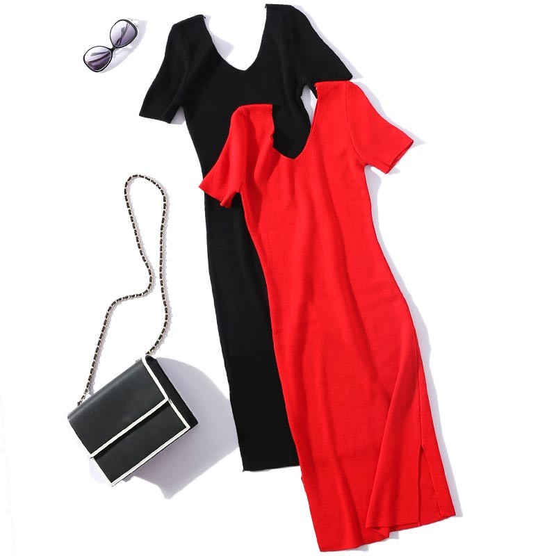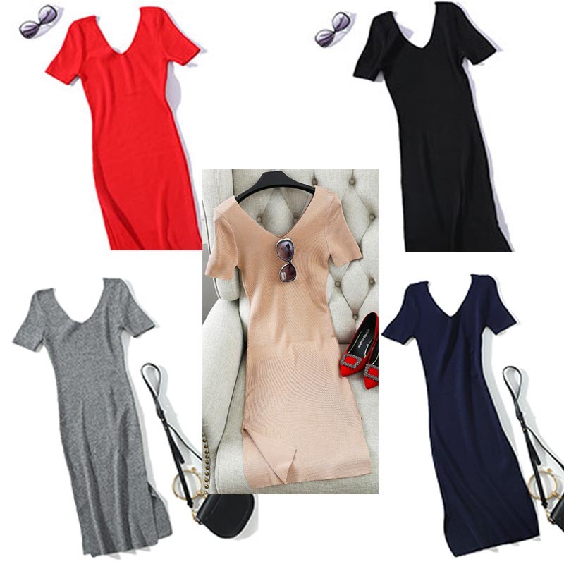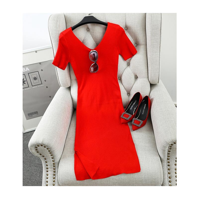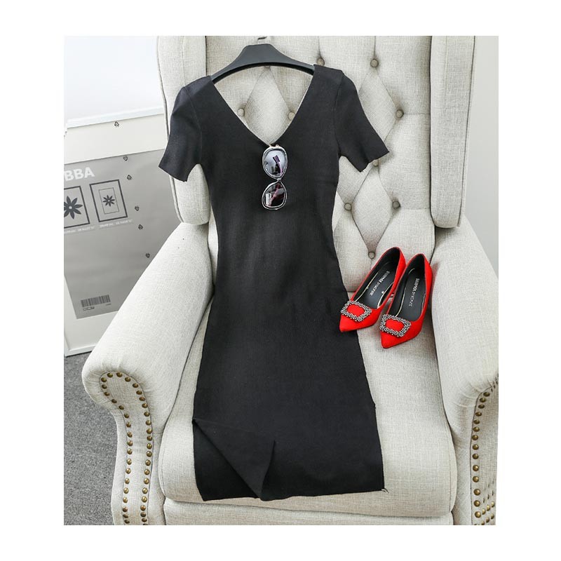 Vネックのシンプルなロング丈半袖ニットワンピース♪