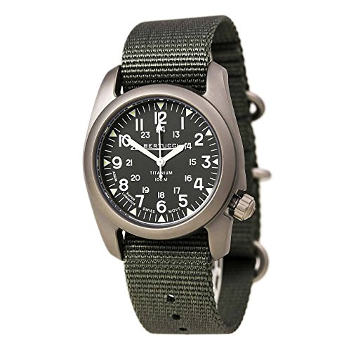 Sport watch, Precision Swiss quartz movement, Polished white sword hands with luminous accents and luminescent sweep seconds, Applied polished white Arabic numbers, Smaller applied polished white Arabic numbers form inner 24-hour time track, Applied luminescent green triangular hour markers and white indices form surrounding minute track, Marine green dial, U.S. patented DX3® heavy duty 2-ply drab nylon strap with contrast stitching and brushed black metal buckle, U.S. patented DX3® matte silver-tone titanium bezel and round case, Textured titanium screw-down crown with logo, Titanium screw-down caseback, Mineral crystal, 100 meters/328 feet water resistantFeature