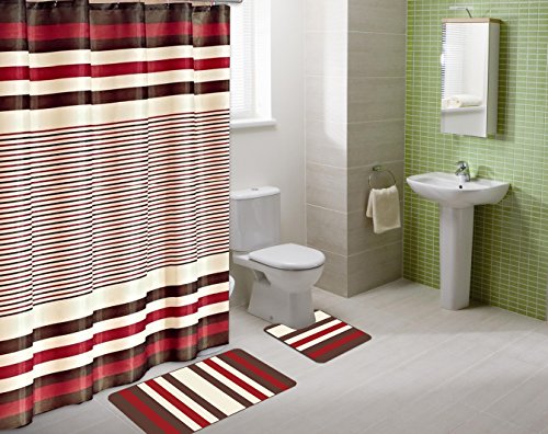 -. Title : Winry Burgundy Striped 15-Piece Bathroom Accessory Set: 2 Bath Mats, Shower Curtain & 12 Fabric Covered Rings
