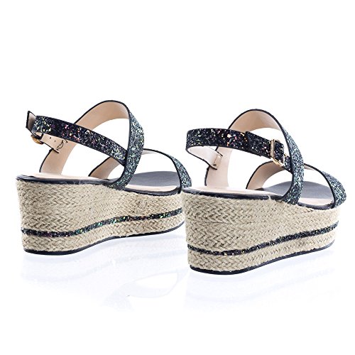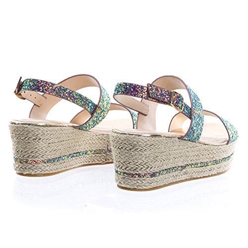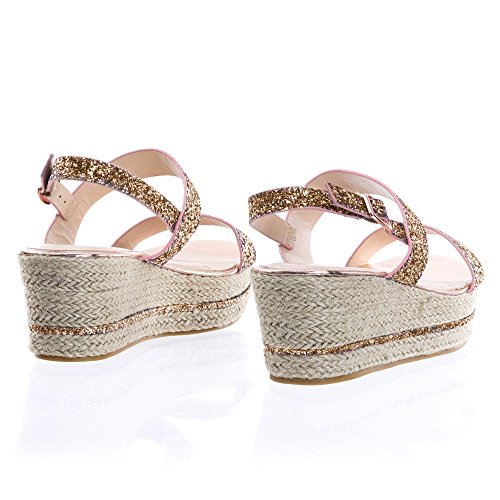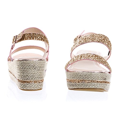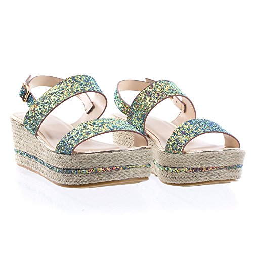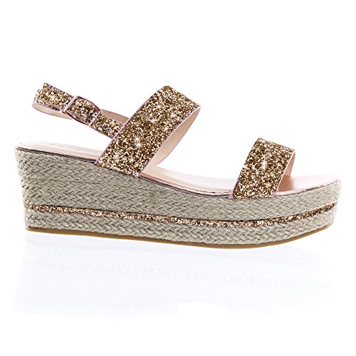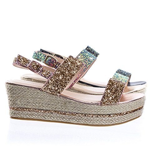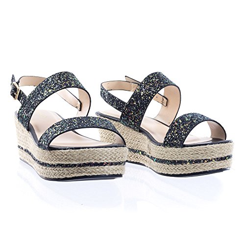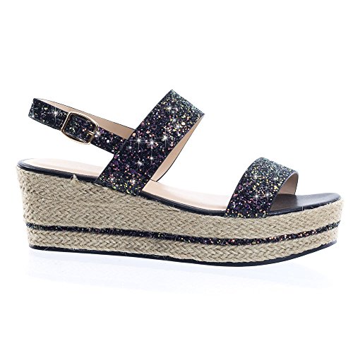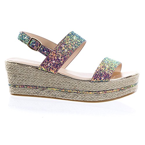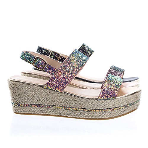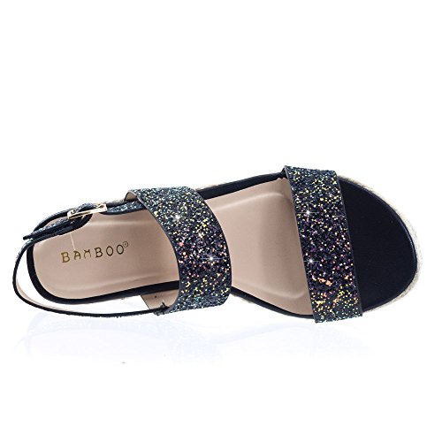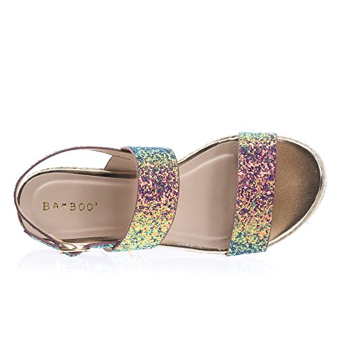 Binding : Apparel Product Description About This Shoes :These 90's rave inspired sandal features a lightly angled platform wedge, jute wrap espadrille platform, rock glitter covered upper strap, thin band of glitter dividing the platform in to two and adjustable ankle strap. These comes in solid golden blush, black glitter with hint of iridescent orange and iridescent that changes color from blue/green to purple/blue depending on the viewing angle. Brand - Bamboo Colors Available: Black, Blush gold, Blue green Occasion: Casual Shoe Type: Platforms Wedges Shoe Style: Platforms Wedges Inner Lining: synthetic Heel Height In Inches - 2.5 Heel Style - Wedge Toe Style - open-toe Platform Height In Inches - 1.5 Shaft Height In Inches - Circumference Opening - Strap Type - ankle-strap Sole - manmade All Man Made Material unless otherwise stated. Computer/Phone/Table monitors might show color differently because of its quality or calibration, we suggest you look at the photo in at least 3 monitors if you need exact color match of your shoes. 0