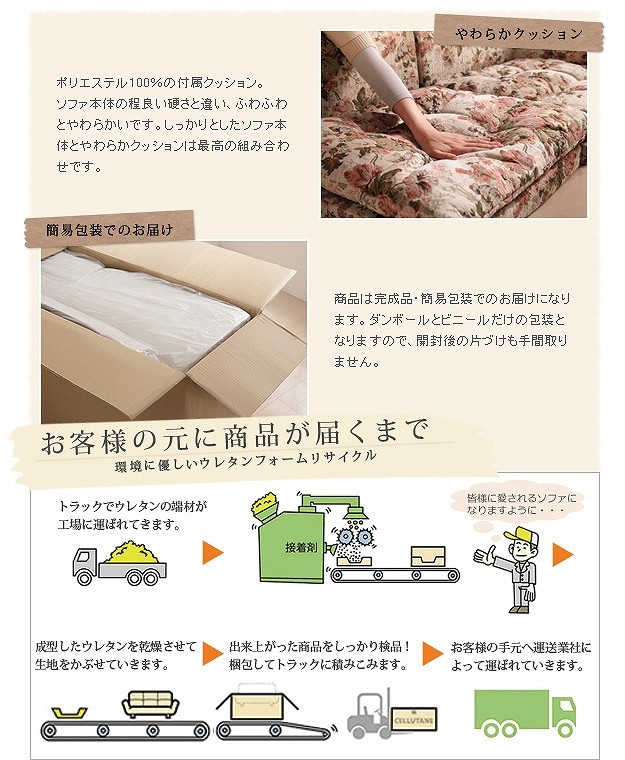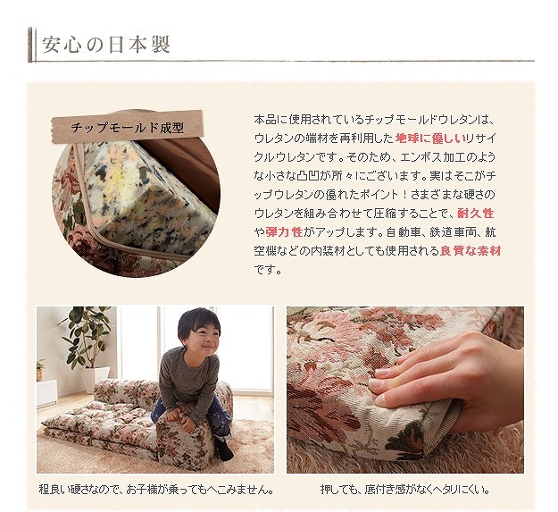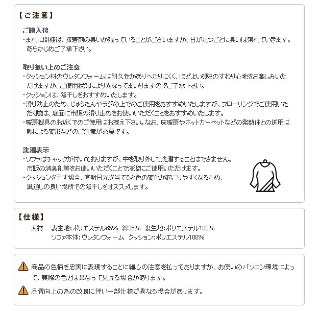 材質:張地(表)-ポリエステル65%・綿35%、張地(裏)-ポリエステル100%、クッション材-ウレタンフォーム、クッション-ポリエステル100%