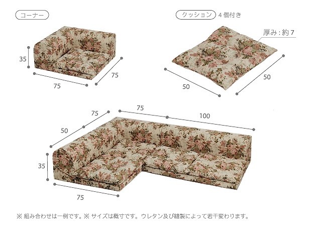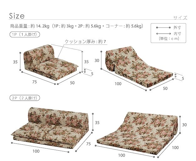 サイズ(cm):(1人掛)幅50・(2人掛)幅100・(コーナー)幅75x奥行75x高さ35cm・総重量約14.2kg
