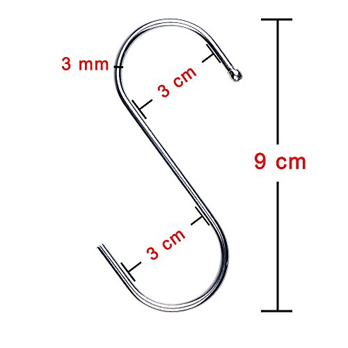-. Feature : Material: metal / Weight: 11g per piece / Length: 9 cm/ 3.5 inches; Maximum bearing weight: 5 kg / S shape, no need to stick or use screws, widely applied in closet, kitchen, bathroom, storage room, garage, workshop, and office / Package includes 20 pieces hooks; Size: 3.5"; Silver color stainless steel S hooks