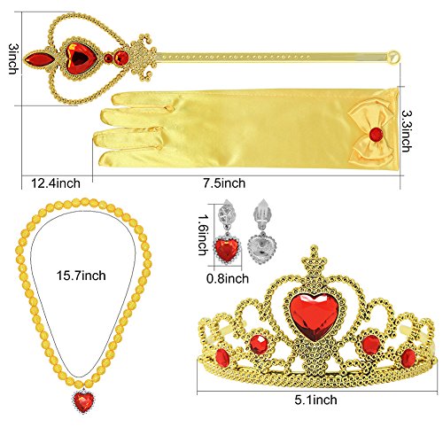 The whole princess dress up set is decorated with glitter details, paired with a red artificial gem and gold edge. Perfect accessories for various princess costumes like Belle, Cinderella, Aurora and Rapunzel costumes.