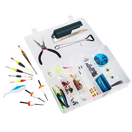 -. Feature : Durable Plastic Case / Tackles includes: Hooks, Shelled Hooks, Spinner, Floats, Dispenser / Sinkers, Coffin Lead, Tube Lead, Spoons, Swivels, Fishing bells / Line Clipper, Rod Holder, Mouth Opener, Jig Heads, Wobblers, Plier,Glow Sticks, Shads, Grubs / Case Dimensions: 12.5" x 8.5" x 2"