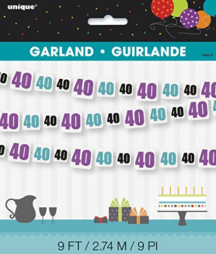 Studio : Unique Publisher : Unique Binding : Kitchen Product Description 1 Birthday Cheer 40th Birthday Paper Garland, Birthday Cheer 40th Birthday Garland measures 9ft, Drape this paper garland from the ceiling, or across archways, doorways, windows, and food tables, Vibrant garland features the number 40 in alternating black, blue, and purple paper cutouts, Coordinate with other Birthday Cheer 40th birthday party decorations and party supplies from Unique. 0