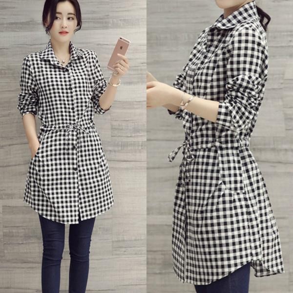 カジュアル オールシーズン 長袖 チュニック スリム ロングシャツ ブラック(チェック)