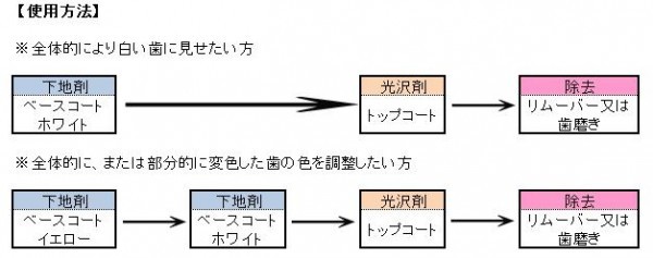 | ベースコート(別売)を塗った後に透明な液で、歯に自然な光沢とつるつる感をプラス。歯をコートするので、トップコートだけでもたばこのヤニ、ワインやコーヒー、紅茶、カレー等の着色汚れを防ぐ事ができます。 |