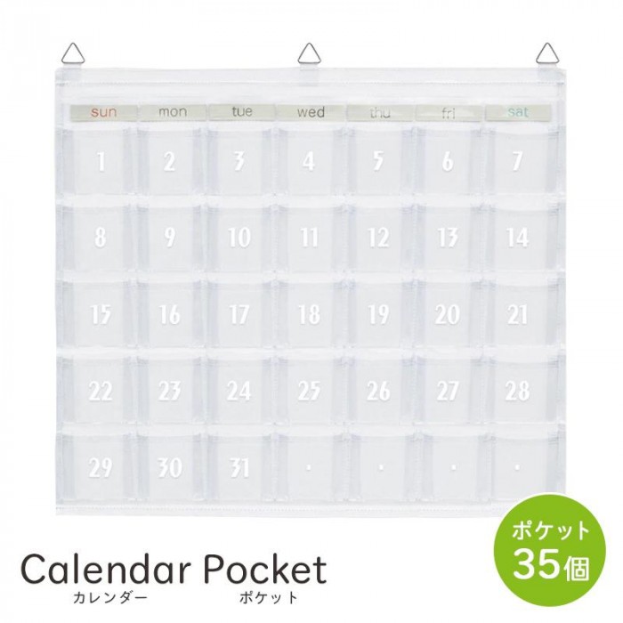 | カードサイズポケットが35個ついたカレンダーポケット♪日付は台布にプリントしているので、物を入れると日付が隠れます。付属の曜日カードを差し替えれば万年カレンダーとしても使えます。予定に合わせて、忘れがちなハンコやポイントカード、小物を収納するなど色々な用途にご使用いただけます♪ |