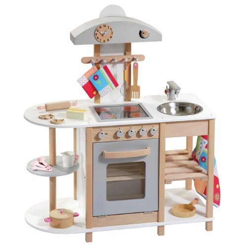 Modern, wooden play kitchen, some parts are colored. There are a lot of lovely details like ceramic hob, oven with baking tray, sink, cooker hood, turn table, 2 pot holders and towel, swivelling buttons with sound... (without accessories). worktop - height 55 cm. width-87 cm, height-102 cm, length-40 cm