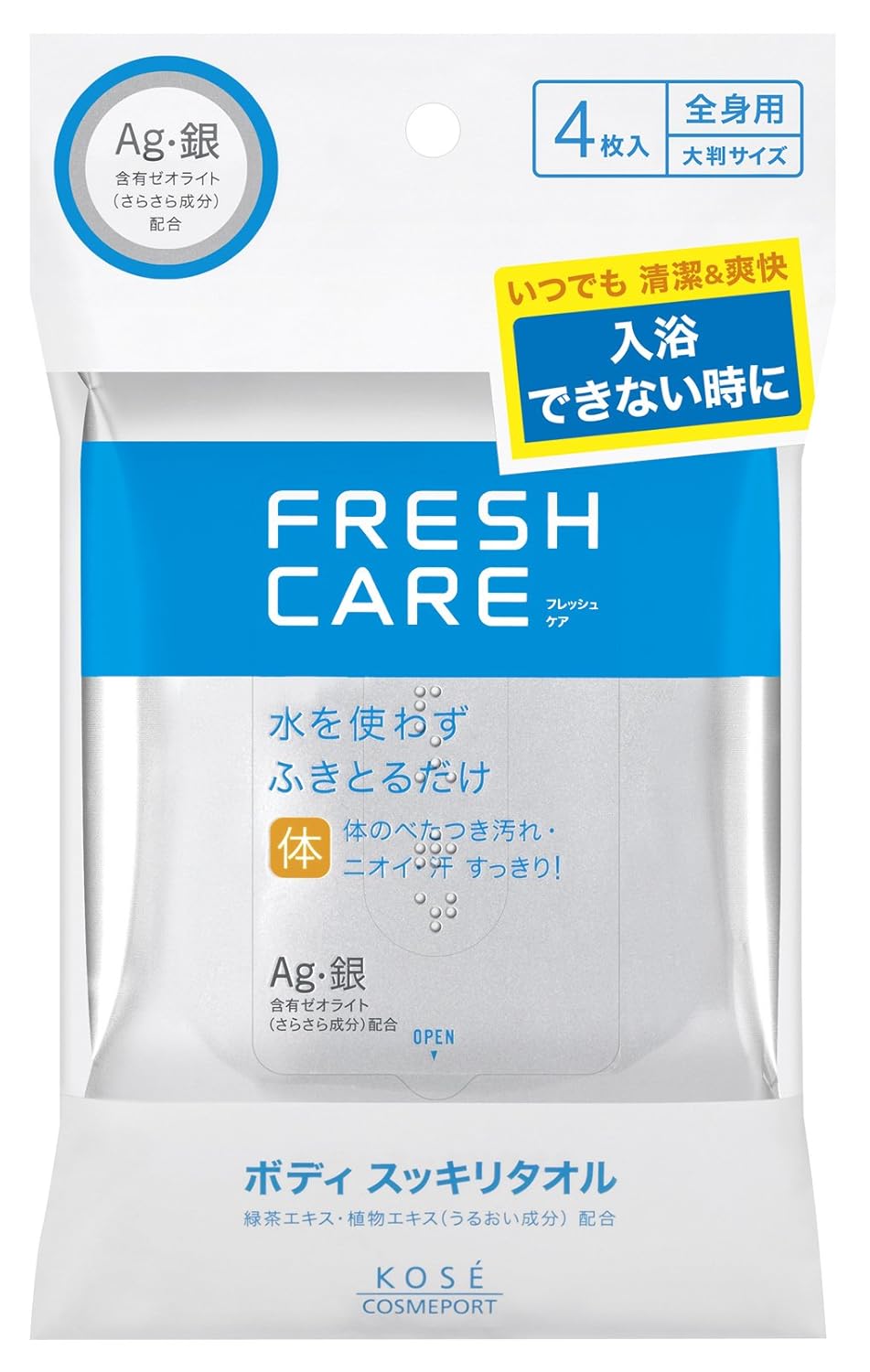 原産国 : 日本 内容量 : 4枚入 全成分 : 水、エタノール、BG、カミツレエキス、チャエキス、PEG-40水添ヒマシ油、クエン酸、クエン酸Na、メントール、(銀/亜鉛/アンモニウム)ゼオライト、メチルパラベン、香料 商品サイズ (幅X奥行X高さ) : 133mm×26mm×204mm