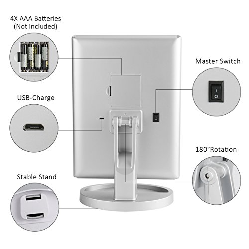 Stable stand provided 180 Degree Free Rotation, you can adjust the makeup mirror up or down, and plenty of adjustment available for horizontal or vertical orientation, benefit for you to find the perfect viewing angle