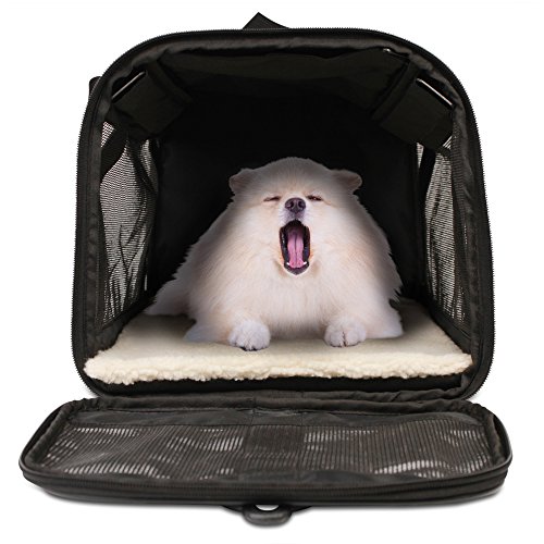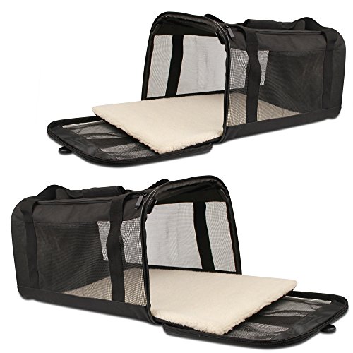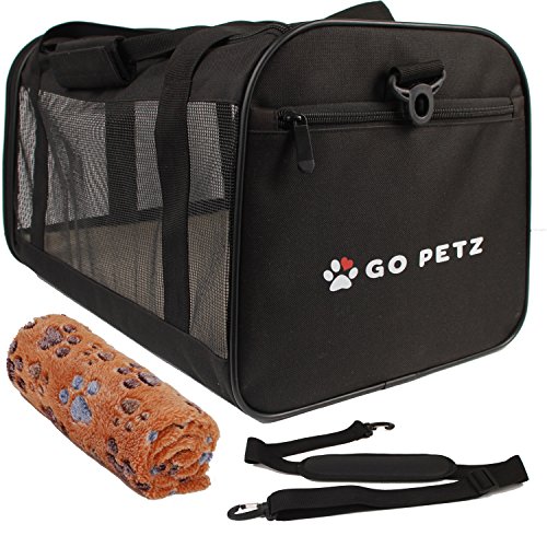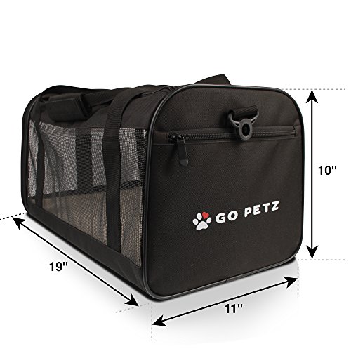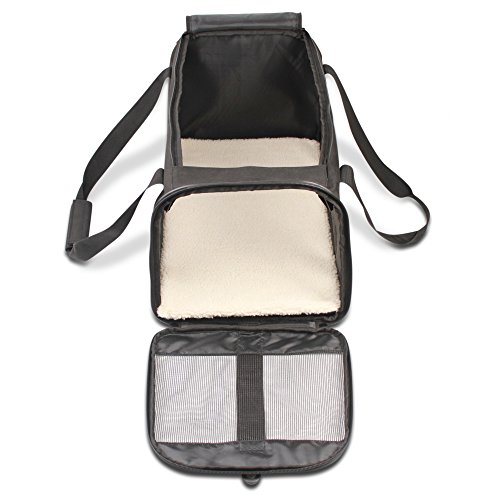 Our Carrier meets the FAA measurement requirement for on board soft side carriers. It will fit under most airline seats. It is always recommended and advised, to check your airline’s rules and regulations regarding traveling with pets. Special features: Our carrier has two entrances, front and top. As you may know or possibly have experienced, some of our four legged friends may be a little reluctant to enter a carrier willingly. The top entrance will help, as you can just pick the little one up and place it safely inside. It is always a good idea to let your pet get used to the carrier prior to traveling. Our carrier is equipped with a solid base panel. Your furry friend’s comfort, security and well-being is our main concern. The PP Board panel will easily hold your pet’s weight and prevent the carrier from caving in. the panel is enclosed in a fleece, zipper locked case. When the need arises, you just remove the panel and hand wash the fleece casing. Our carrier is designed and built to hold its shape. The two main features that keep our carrier upright are the metal loop piping on both ends, and the two support bars, which were added to provide even more structural support. These bars slide in their pockets easily and can be removed at will. Your comfort is also a priority for us. In addition to the carrying handles, we’ve included an adjustable and padded shoulder strap.