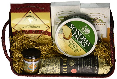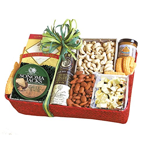 -. Binding : Grocery -. Brand : California Delicious -. EAN : 0735201712055 -. Feature : Tastes of California for everyone on your gift list / Nunes farms nuts and Columbus salami / Organic dried apples / Every bow tied by hand / Made with love in California -. IsAdultProduct : 0 -. Label : California Delicious -. Manufacturer : California Delicious -. NumberOfItems : 1 -. PackageQuantity : 1 -. ProductGroup : Grocery -. ProductTypeName : GROCERY -. PublicationDate : 2015-09-06 -. Publisher : California Delicious -. ReleaseDate : 2015-09-06 -. Size : 4 Pound -. Studio : California Delicious -. Title : California Delicious Savory Cheese and Nuts Gift Basket, 4 Pound -. UPC : 735201712055