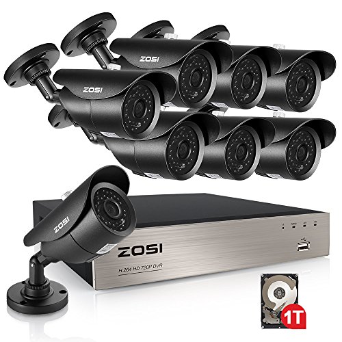 ZOSI 8-Channel HD 720P Video Security System DVR and (8) 1.0MP Indoor/Outdoor Weatherproof Cameras with IR Night Vision LEDs- 1TB HDD,120ft(40m) Night Vision, Motion Alert