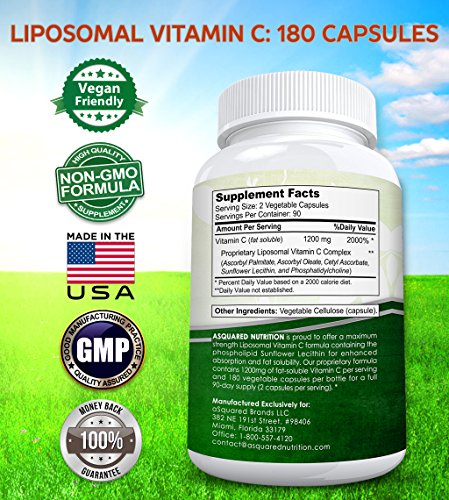 -. Feature : MAX STRENGTH FORMULA: aSquared Nutrition's maximum strength Liposomal Vitamin C formula contains 1200mg of Liposomal Vitamin C per serving, and 180 vegetable capsules in each bottle for a full 90 day supply. Don't settle for other products that only offer 120, 90 or 60 capsules, tablets, softgels or pills, or that only provide 1000mg or 500mg per serving. Our fat soluble Vitamin C supplement ensures superior absorption and bioavailability absent unwanted side effects. * / ENHANCED ABSORPTION: Our potent formula utilizes the phospholipid sunflower lecithin to create liposomes helping the body more effectively absorb the vitamin C in our complex. The Non-GMO Phosphatidylcholine in our formula is crucial to liposome formation, and helps to ensure superior absorption and bioavailability into the body, into the bloodstream, and at the cellular level. * / NON-GMO & VEGAN FRIENDLY: Our proP.R.Ietary Liposomal Vitamin C formula contains 1200mg of fat soluble Vitamin C per serving (2 capsules per serving), and is made with Sunflower Lecithin & Non-GMO Phosphatidylcholine. Our formula does not contain soy, gluten or dairy. Additionally, it is Non-GMO, Vegan & Vegetarian friendly, and does not contain preservatives. Our liposomal technology helps prevent gastrointestinal & stomach discomfort and works to optimize cellular absorption. * / AMAZING HEALTH BENEFITS: Vitamin C (ascorbic acid) contains powerful antioxidant properties & helps protect against free radical damage. It boosts the immune system, supports healthy brain function & cognition, supports cardiovascular & heart health, supports blood circulation, helps improve mood, contains anti-aging properties such as minimizing wrinkles, supports bone density, helps decrease muscle soreness, and helps increase absorption of calcium & iron. * / LIPOSOMAL TECHNOLOGY: Our complex combines ascorbic acid & palmitic acid to create the ester Ascorbyl palmitate. Amazingly, Ascorbyl palmitate is a fat-soluble form of Vitamin C. When combined with a phospholipid such as sunflower lecithin, a liposomal environment can be created. Vitamin C can be found in capsules, softgels, tablets, pills, powders, liquid, drops, spray, droplets, vapor, gummies, & packets. Serving sizes can be 500mg, 1000mg, 1200mg, 1500mg, and more depending. *