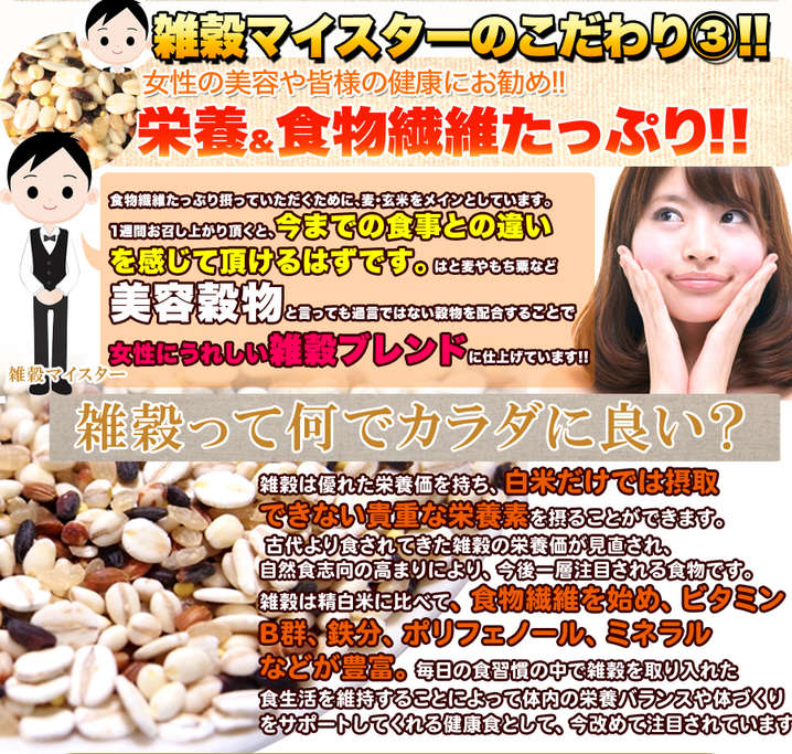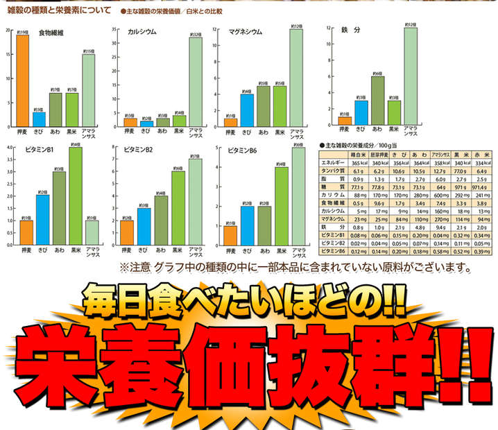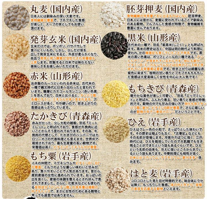 ●原材料名:丸麦、押麦、発芽玄米、黒米、赤米、もちきび、たかきび、ひえ、もち粟、はと麦