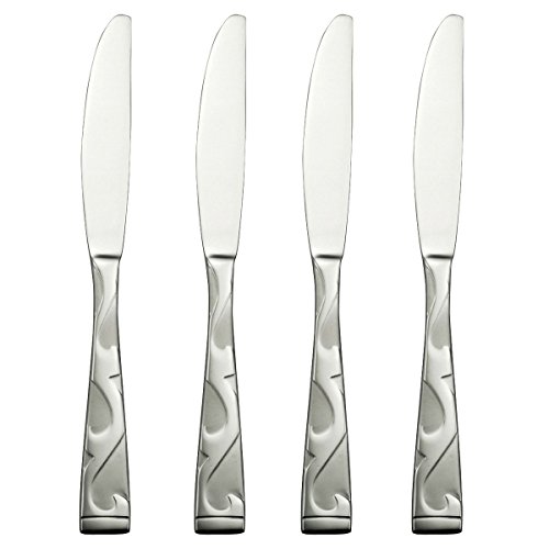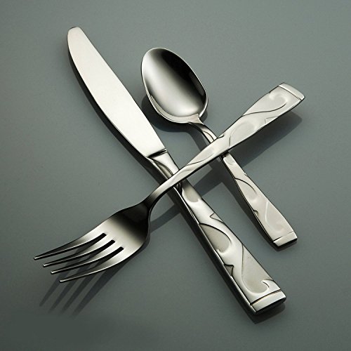 A scroll-like a stylized grapevine winds its way from the square tip end to the narrow point of the neck, where is dissolves into the mirrored finish of Tuscany's wide bowls. The hi-luster organic scroll motif is balanced with the bead-blasted handle with band accent at the tip end